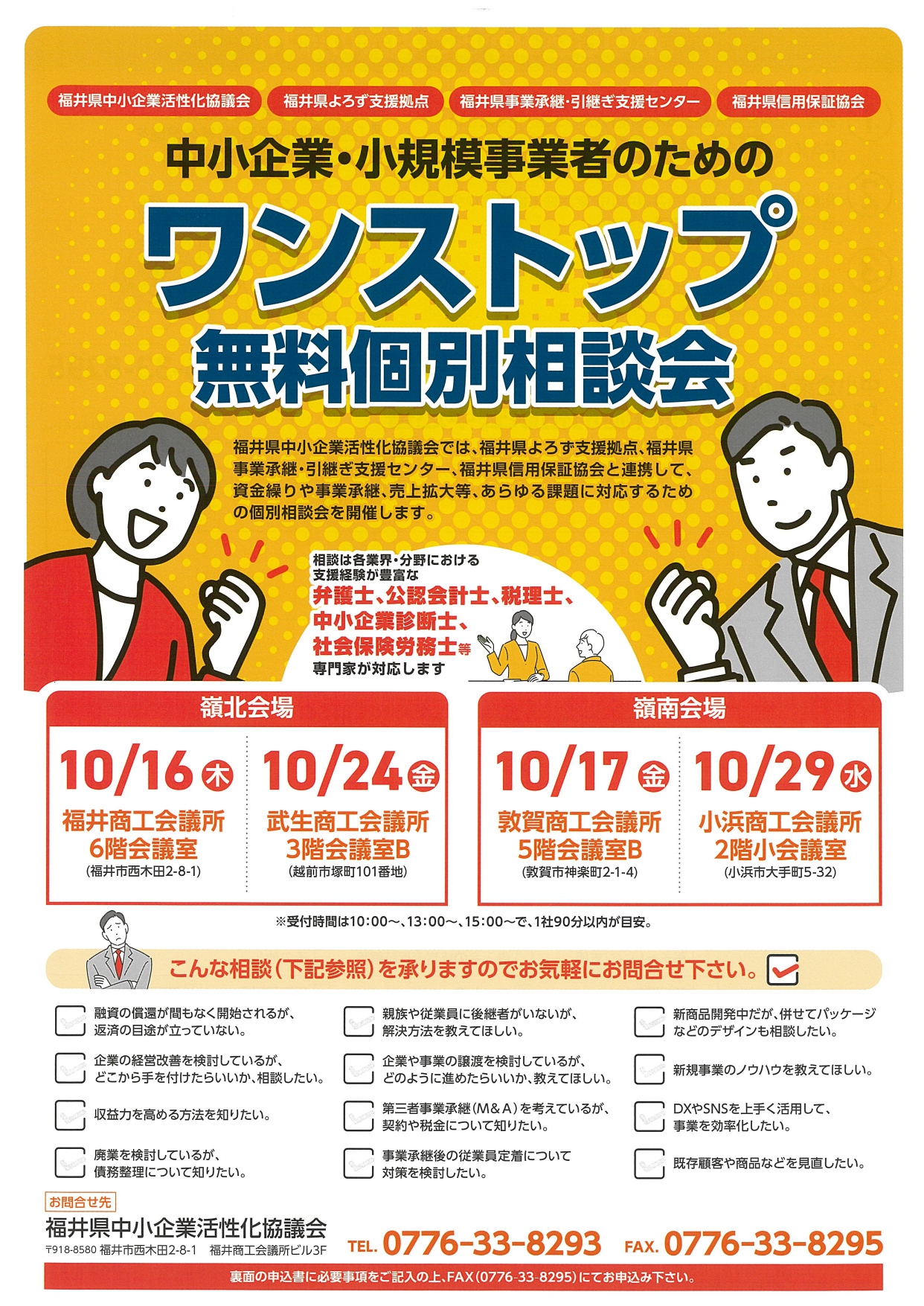福井県信用保証協会では、福井県中小企業活性化協議会、福井県よろず支援拠点、福井県事業承継・引継ぎ支援センターと連携して、資金繰りや事業承継、売上拡大等、あらゆる課題に対応するための個別無料相談会を開催します。相談は各業界・分野における支援経験が豊富な専門家が対応します。
